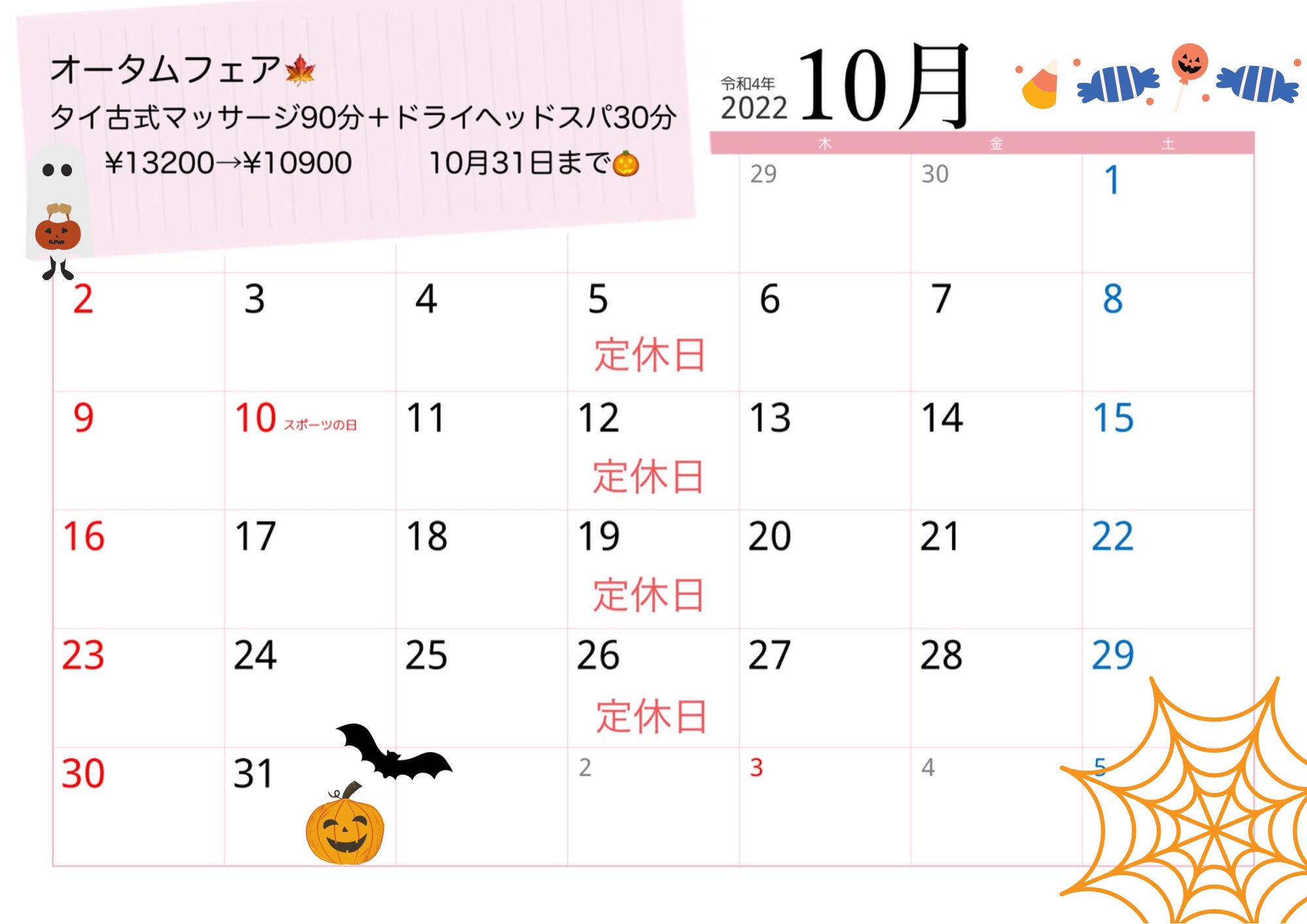 ☆10月休業日のご案内☆