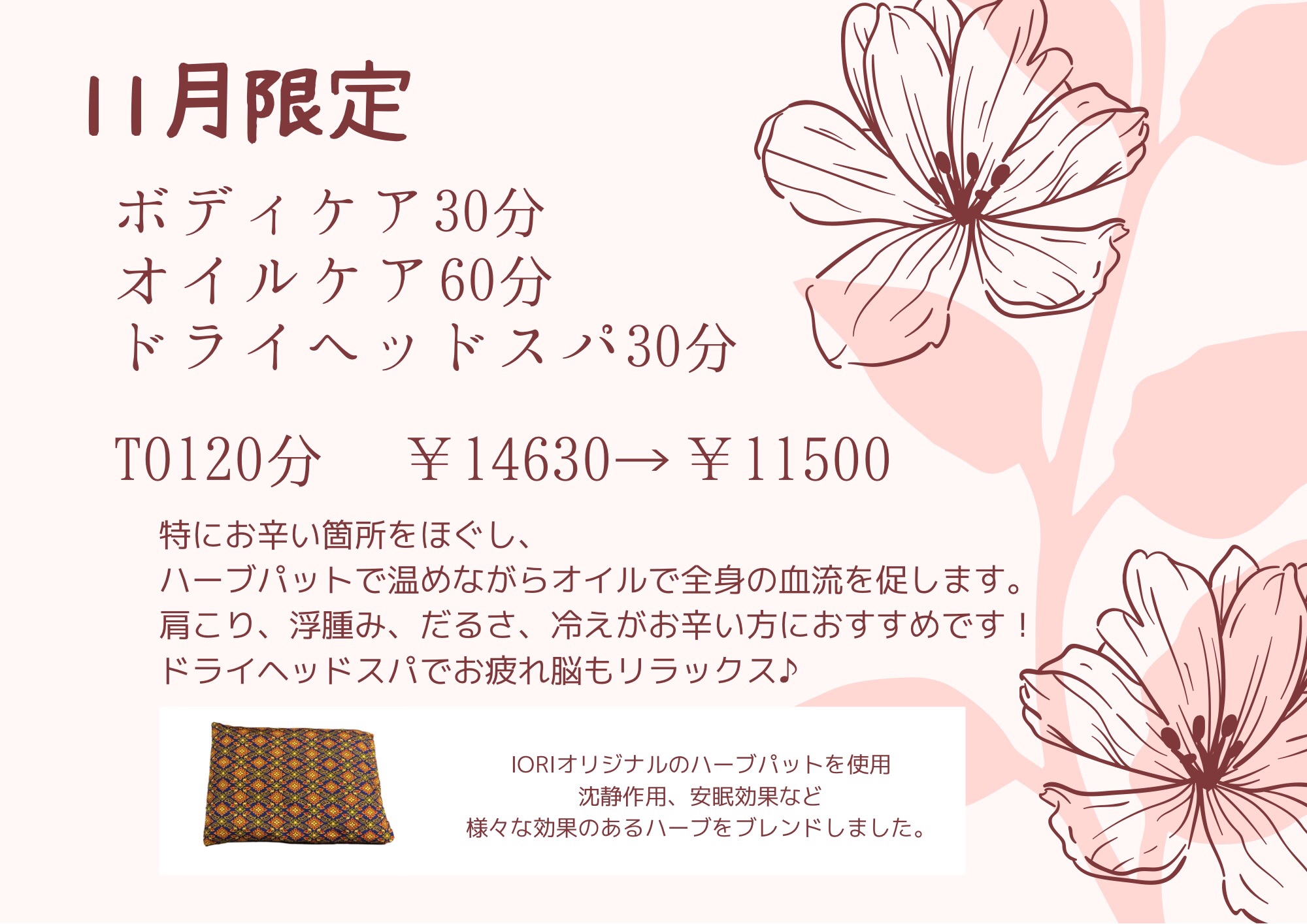 ボディケア30分+オイルケア60分+ヘッドスパ30分 計120分