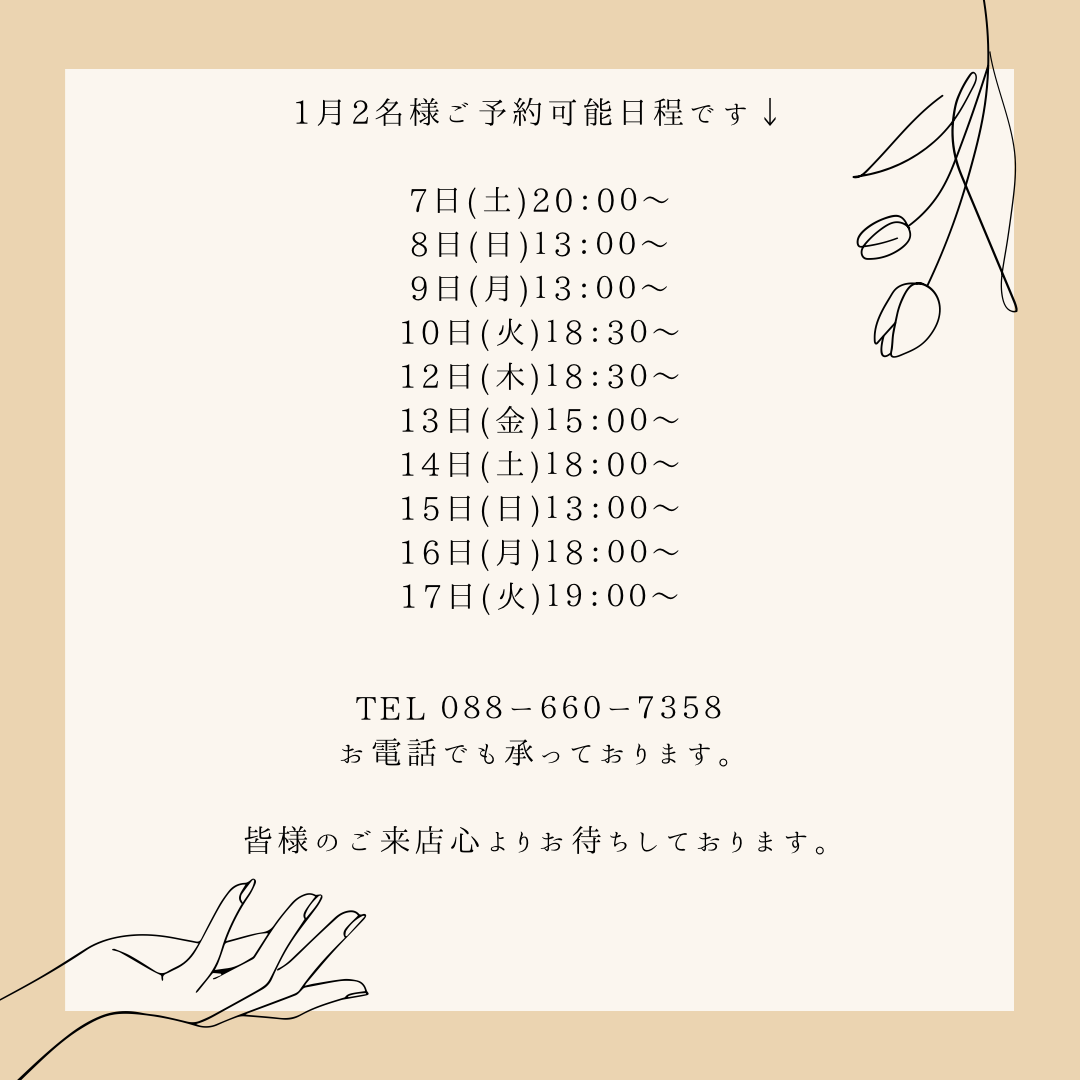 1月前半2名様ご予約可能日程です↓