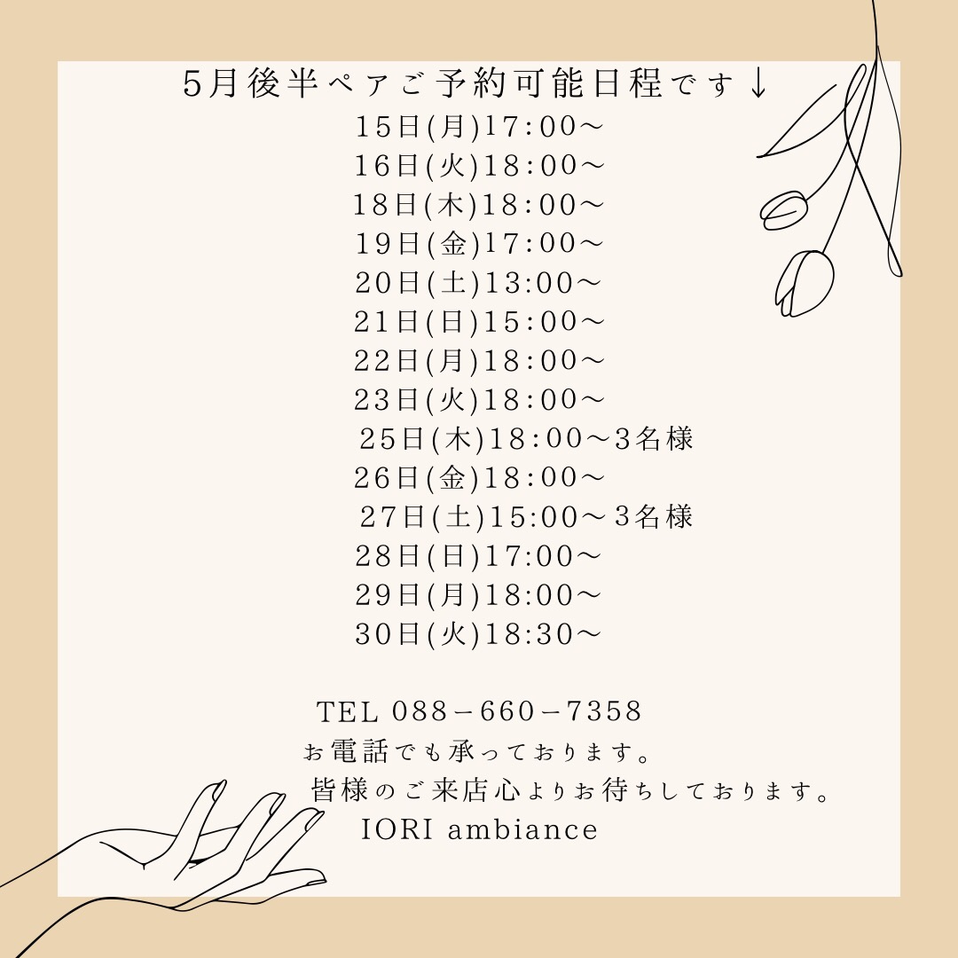 5月後半の2名様、3名様同時ご予約日程のご案内です↓↓